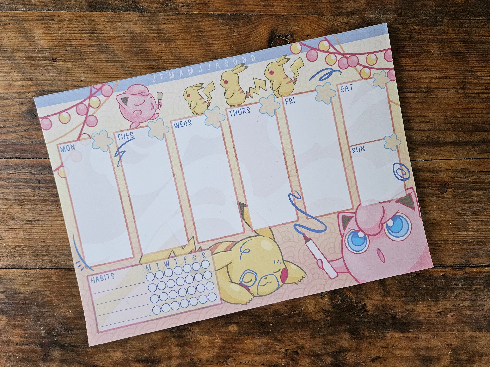 Each page depicts a week ready for planning at your desk. Pairs really well with the planner sticker sheets for organized peeps! Choose from Pink & Yellow (Pikachu/Jigglypuff) or Green & Brown (Grass/Ground types).