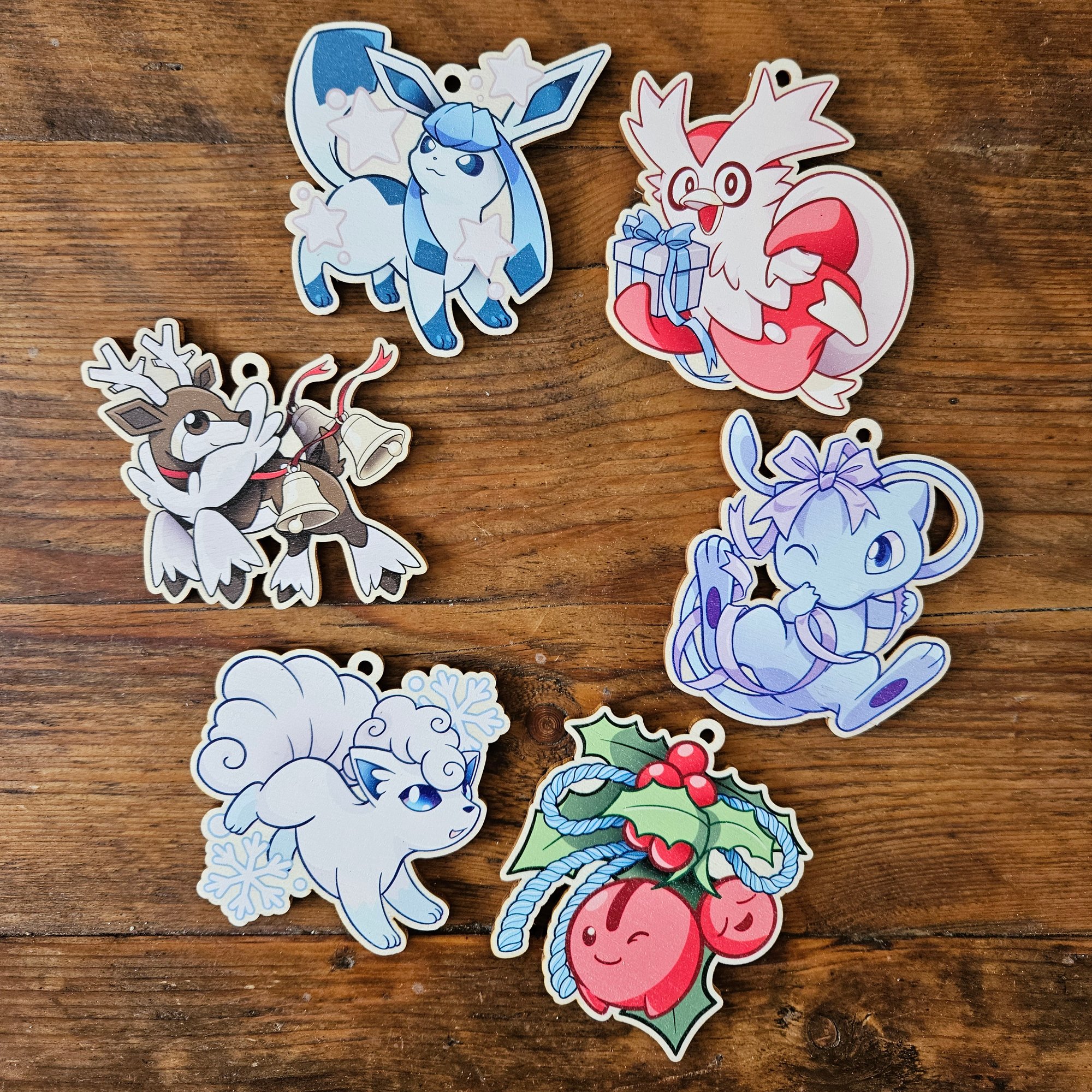 A set of six Pokemon themed Christmas decorations for your tree! Made from responsibly sourced (FSC or PEFC certified) woodand laser-cut with a 4mm hole (& supplied gold thread eith clasp!) So that they can be hung from your Christmas tree - or anywhere else you want to decorate!